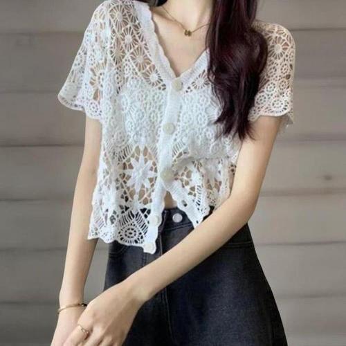 여자 뜨개 펀칭 반소매 썸머 스웨터 가디건