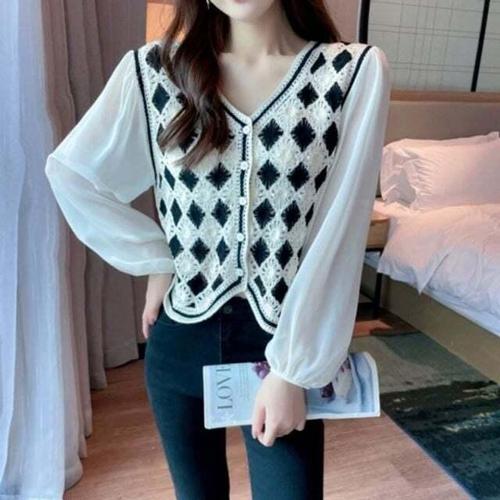 [모노무드]LMO 여자 골패턴 브이컷 봄철 컴포트 F/W 롱슬리브 뜨개탑 탑블랙컬러