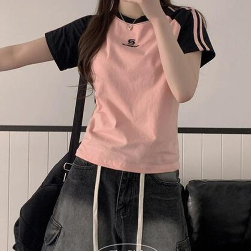 더핑크 / 채이 루즈핏 배색 트랙 라인 자수 반팔티