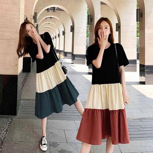 [라일리여성의류] Rly 롱 A라인 원피스 여름 루즈핏 반팔 여자 배색