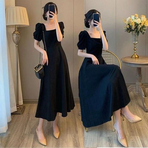 [라일리여성의류] Rly 퍼프 롱 스퀘어넥 하객룩 여자 원피스 블랙 반팔