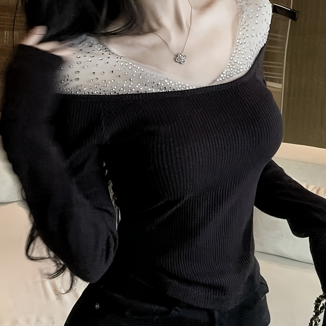 TEMU 프렌치 스타일 고급 라인스톤 패치워크 오프숄더 긴팔 탑, 신상 하이엔드 레이어링 핏티셔츠, 우아한 티셔츠