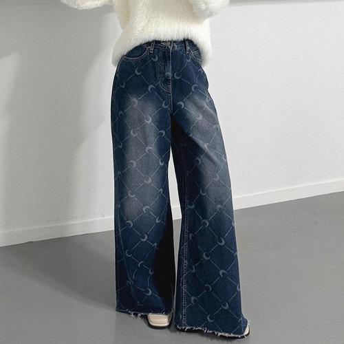[옷자락]여자 키치 달프린팅 체크 약기모 컷팅 나팔 통 청바지