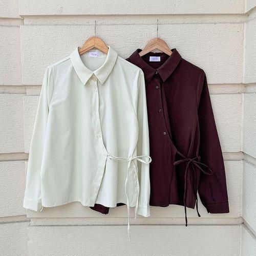 [옷자락] 여성 오버사이즈 랩 셔츠 언발 가을 출근룩 리본 박시셔츠