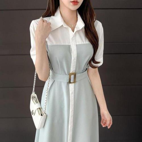 [신상오픈런]여성 하객 스타일 배색 벨트 셔츠 반팔 롱 드레스