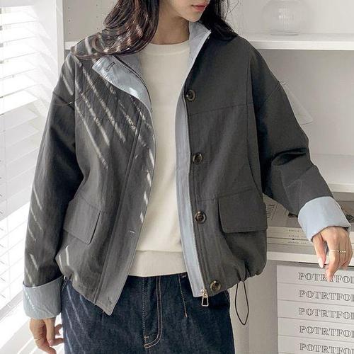 [신상오픈런]여성 오버사이즈 배색 롤업 버튼 히든 집업 스트링 재킷