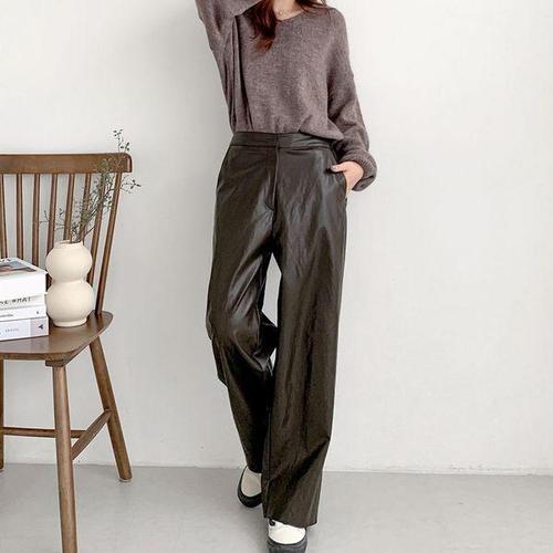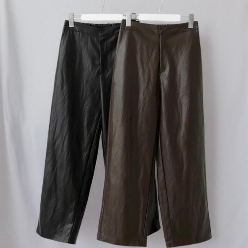 [신상오픈런]여성 스트레이트핏 가죽 팬츠 밴딩 포켓 와이드 바지