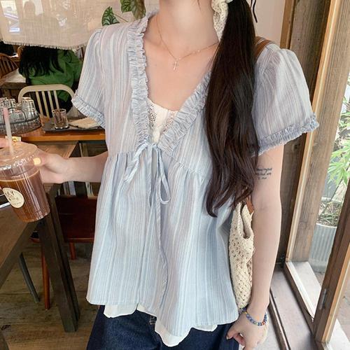 [샵앤][샵앤] 여성 스트라이프 레이스 프릴 반팔 블라우스 MSE-WBL-20761-소라