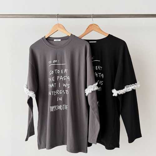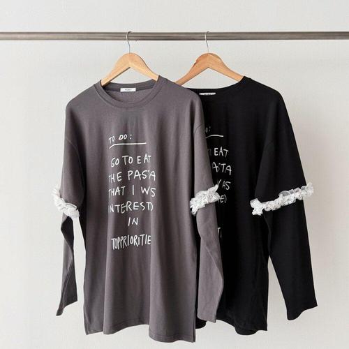 [옷자락] 여성 키치 문구 레이스 트임 루즈핏 레이어드 티셔츠
