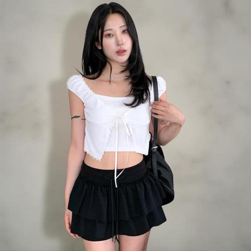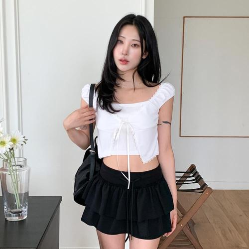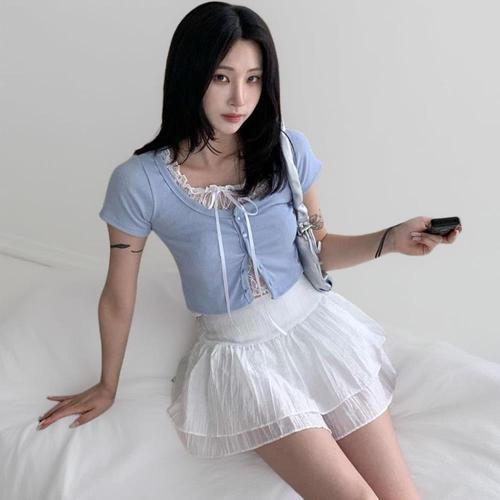 [옷자락]여성 사랑스러운 레이스 리본 레이어드 버튼 크롭 반팔티