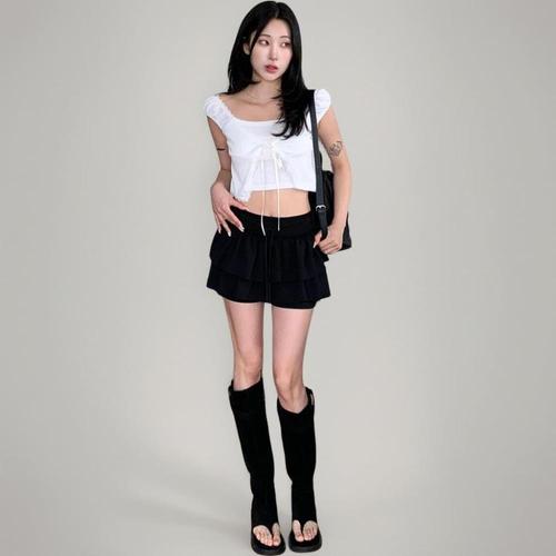 [신상오픈런]여성 크롭 레이스 리본 셔링 골지 티셔츠 레이어드