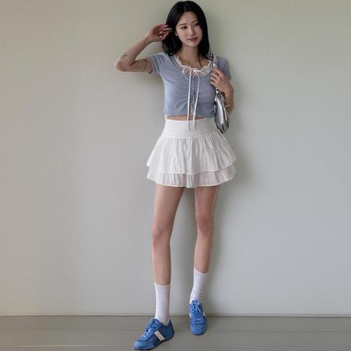 [신상오픈런]여성 크롭 티셔츠 레이어드 골지 레이스 리본 셔링 디자인