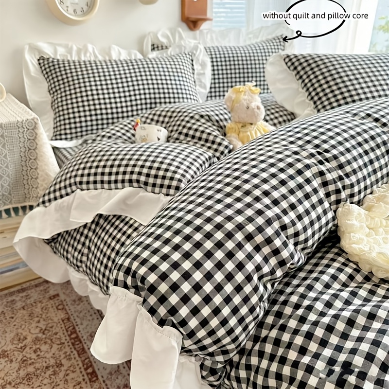 TEMU 3개 블랙 앤 화이트 체크 프린트 레이스 침구 세트 (솜 제외). 이불 커버와 베갯잇 포함. 레이스 장식과 지퍼로 간편하게 세척 가능. 편안하고 부드러운 통기성 좋은 원단으로 사계절 내내 사용 가능