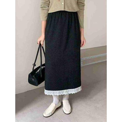 [옷자락]여자 벨벳치마 A라인 배색 레이스 밴딩 가을 롱스커트