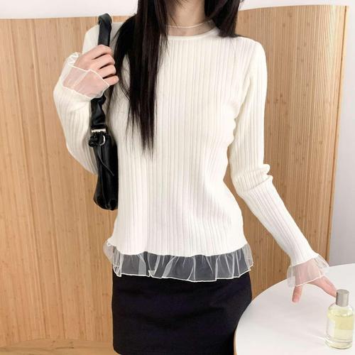 [시크블랙]커프루 레이스 배색 슬림핏 쉬폰 니트
