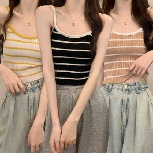 [옷자락] 여자 데일리 레이어드 스트라이프 니트 끈나시