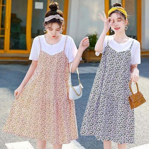 [셀럽하우스]여성 QBCJ0632 컬러풀 플라워 반팔 나시 레이어드 원피스