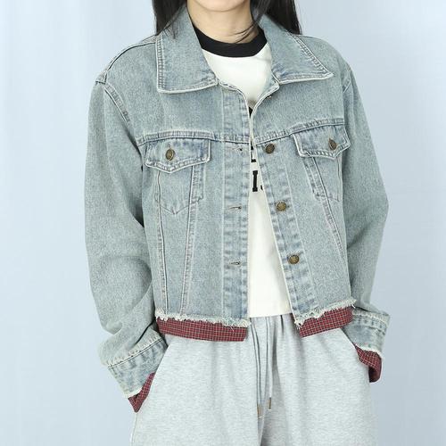[파라노말샵]데님 체크 레이어드 크롭 청 자켓 (파라노말샵)