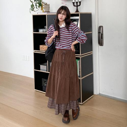[시크블랙]크호이 골덴 체크 레이어드 밴딩 롱스커트
