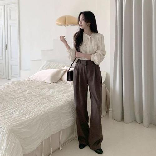 [옷자락]여성용 심플 레이온 스판 와이드 핏 뒷밴딩 슬랙스