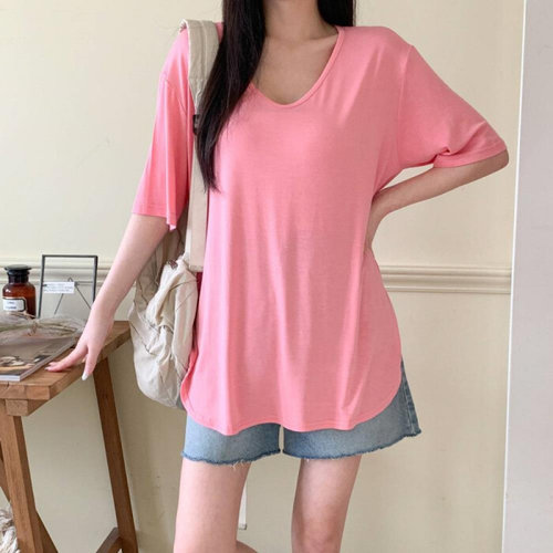 [신상오픈런]여성용 슬림핏 반팔티 레이온 스판 무지 반목 데일리 티셔츠
