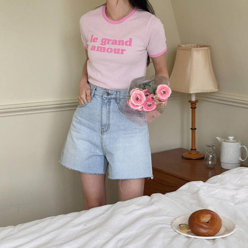 옷자락 / 여자 레이온 스판 배색 레터링 와플 반팔 티셔츠