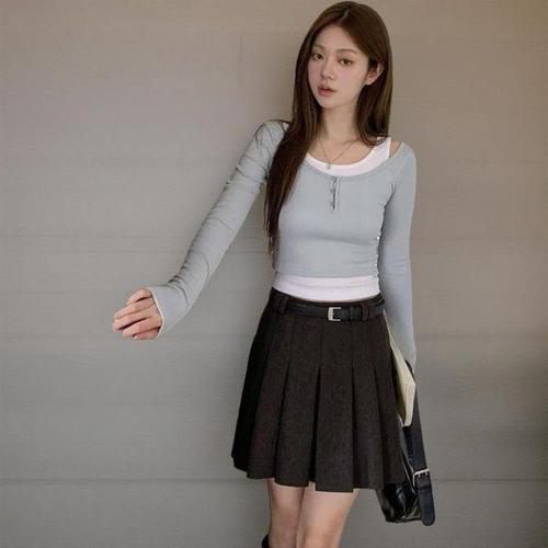 [신상오픈런]여성 레이온 스판 레이어드 유넥 슬림핏 긴팔 티셔츠