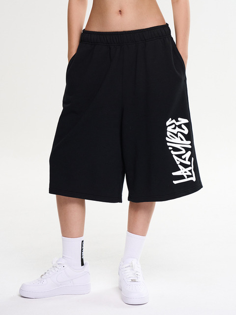 [레이지비] 자이언트핏 와이드 버뮤다 스웨트 팬츠 빅로고 헬스 운동복 반바지 W 블랙