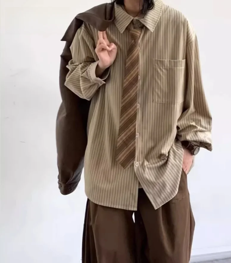 루즈 캐주얼 긴팔 코듀로이 셔츠 봄 가을 일본 스타일 세트 빈티지 홍콩 스트라이프 남성 대학 스타일 셔츠