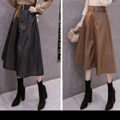 미즈큐즈 / 레더 레자 가죽 포켓 밴딩 A라인 치마 플레어 롱 스커