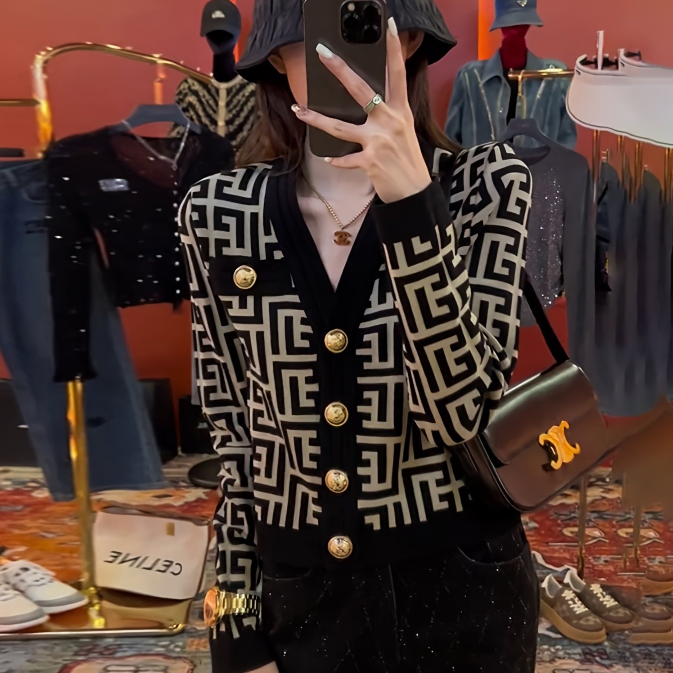 TEMU 탈리스먼드 밑단 퍼지 버튼 프론트 가디건, 우아한 대조 트림 V넥 긴팔 가디건 - 여성용 가을 겨울 의류