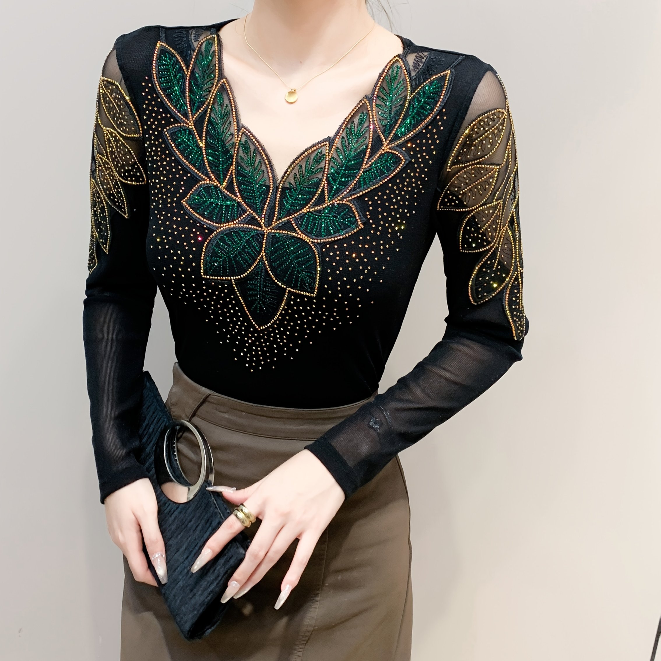 TEMU 가을 신상 크로스 V넥 우아한 긴팔 메쉬 탑 스타일리시 시퀸 반짝이 티셔츠