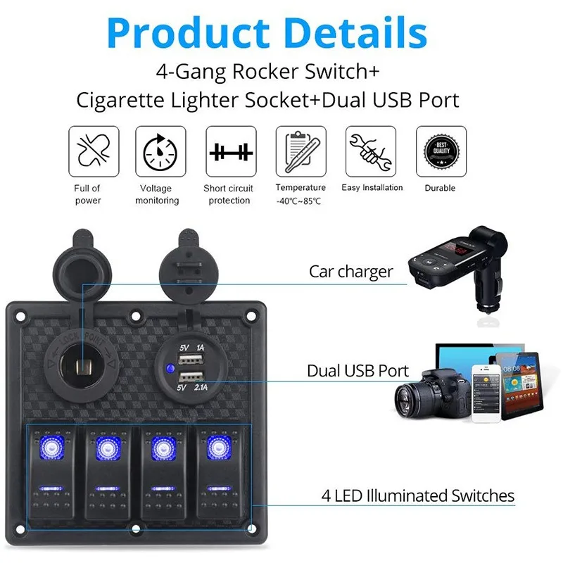 2025 4-갱 로커 스위치 차량용 충전기, USB + 시가 라이터 패널 자동차 개조용