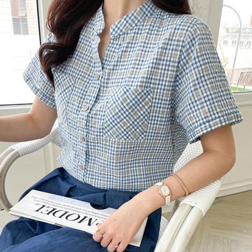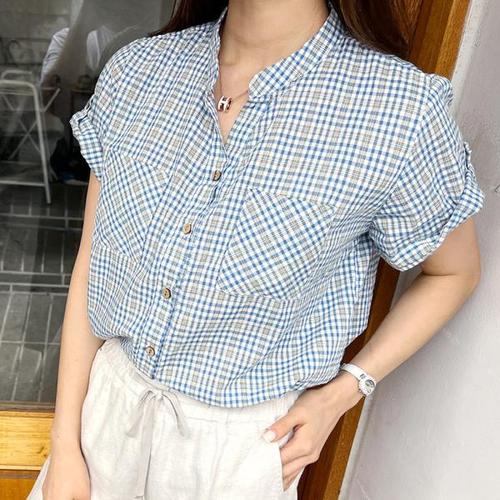 [옷자락]여성 더블포켓 버튼업 롤업 소매 반팔 블라우스