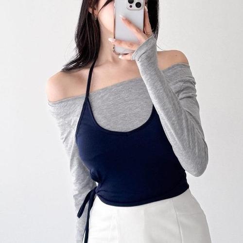 [다잇템][다잇템] 여자 홀터네크 롱슬리브 콘트라스트 볼드숄더 슬리브리스 티셔츠_23075736_588872
