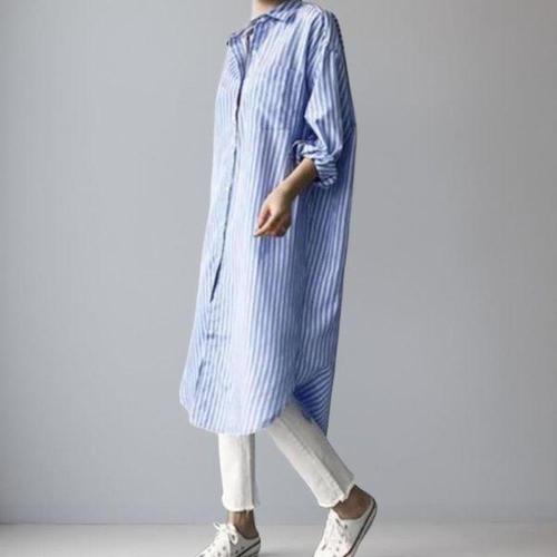 [신상오픈런]여성 클래식 스트라이프 루즈핏 블루 롱셔츠