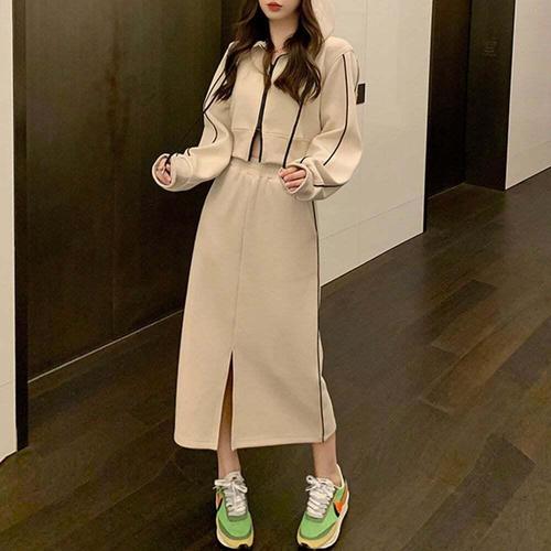 [셀럽하우스]데일리룩 XUAB3186 후드 투피스 세트 여성 캐주얼 롱스커트