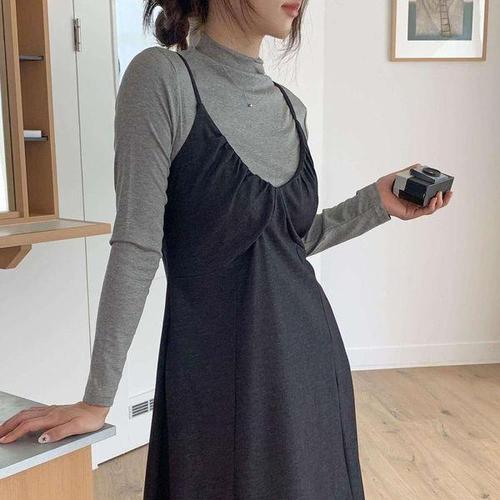 [신상오픈런]여성 폴라넥 긴팔 티셔츠와 어깨끈 롱 원피스 세트