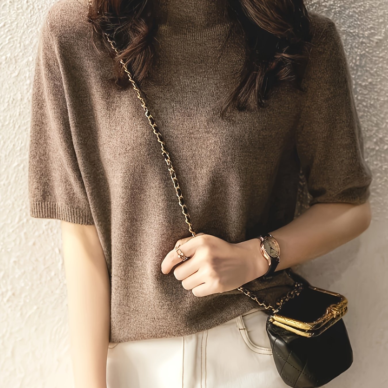 TEMU 여성용 우아한 하이넥 이슬리키 파이버 스웨터 - 소프트 브라운 루즈핏 튜닉탑, 캐주얼 & 포멀룩에 어울리는 올시즌 레이어링 피스, 다재다능한 스웨터, 크롭드 스웨터, 롱슬리브 카지ュ얼 스웨터, 컬러풀 로지 스웨터, 케이블 가디건