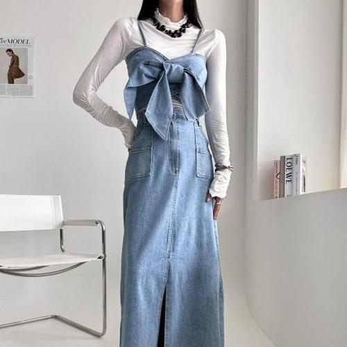 [다잇템][다잇템] 여자 청청 코르셋 에이라인 슬릿 리본 롱치마 세트_18689287_588872