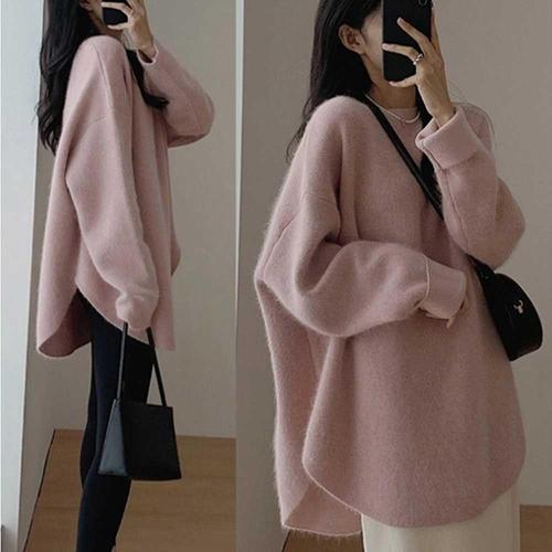 [셀럽하우스]여자 QGKE9514 가을 출근 룩 편안한 루즈 핏 박시 롱 니트 코디