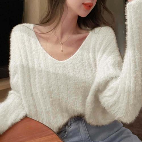 [셀럽하우스]여자 UCYS1404 데이트 룩 루즈 여리 핏 브이넥 긴팔 니트 코디
