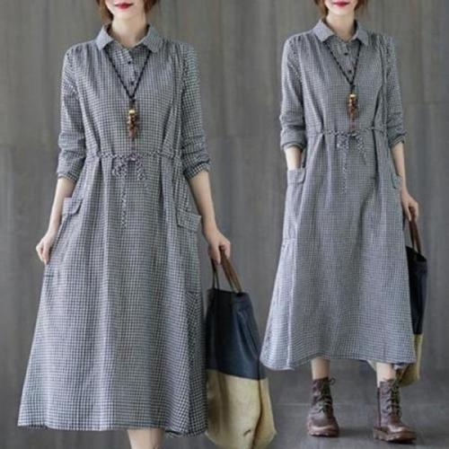[엄지척]여성 여름 체크 반팔 루즈 오버 핏 롱 원피스_19911987_667501