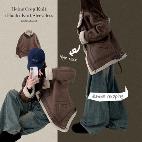 [모노폴로지]오버핏 크롭 스웨이드 무스탕 양털 하이넥 후리스 레더 뽀글이 자켓 패딩