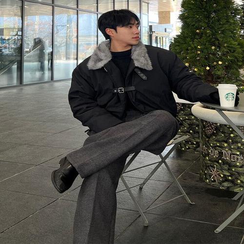 [디바옴므]겨울 박스핏 하이넥 벨티드 집업 무스탕 점퍼
