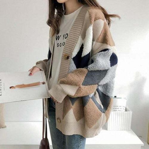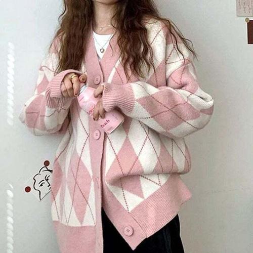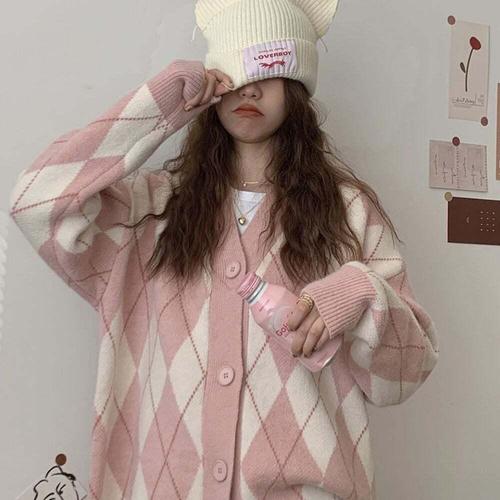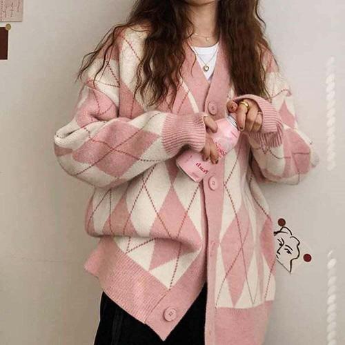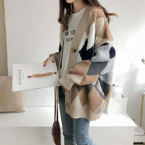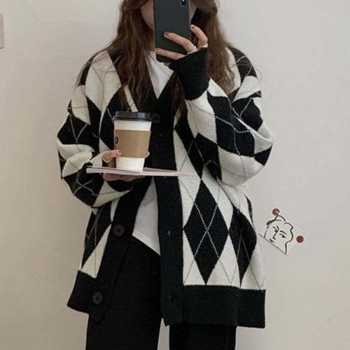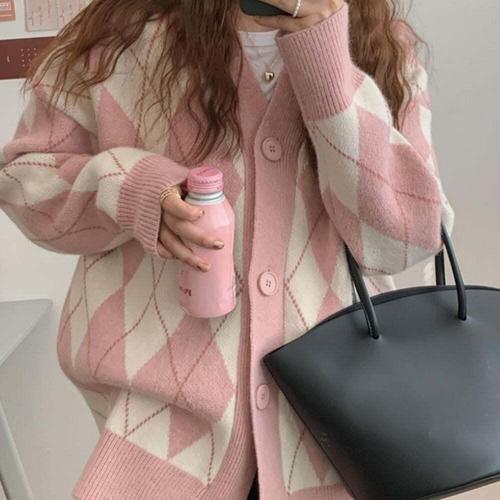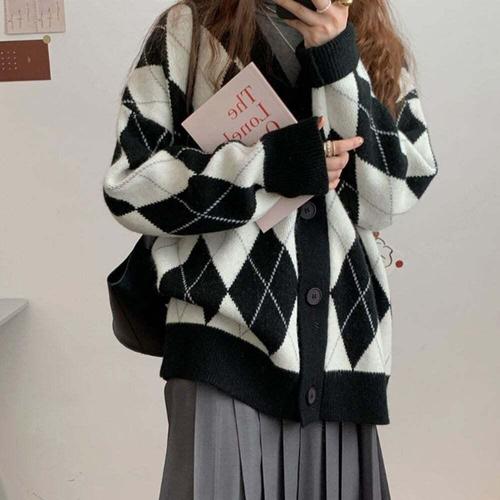 [셀럽하우스]패턴 SKSE2466 가디건 오버핏 아가일 브이넥 베이직 여성