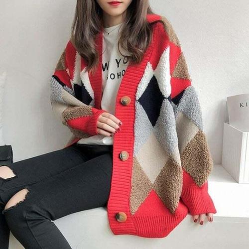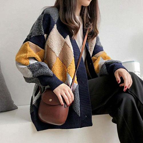 [셀럽하우스]봄 JZQM2272 가을 도톰한 아가일 패턴 여성 루즈핏 배색 가디건