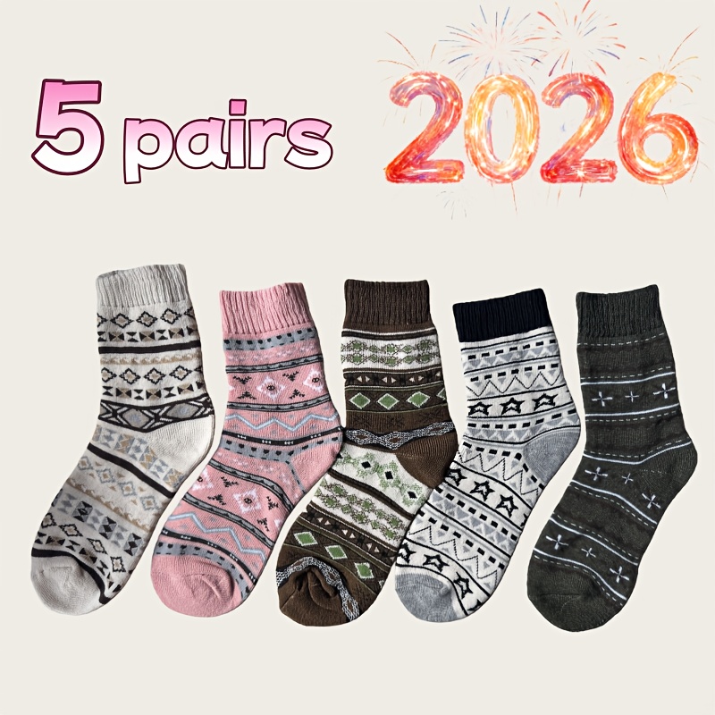TEMU 여성용 가을-겨울 두꺼운 빈티지 패턴 양말 5켤레 | 중간 길이의 따뜻함 및 방한 기능, 원단, 기하학적 패턴