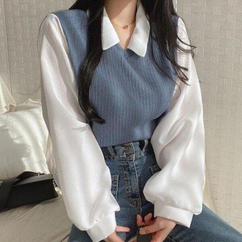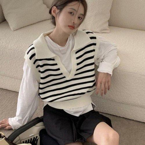 [모노무드]LMO 폴로카라 레이디스뜨개탑 경량베스트 걸 스트라이프 트렌디 세미크롭 니트웨어 베스트탑