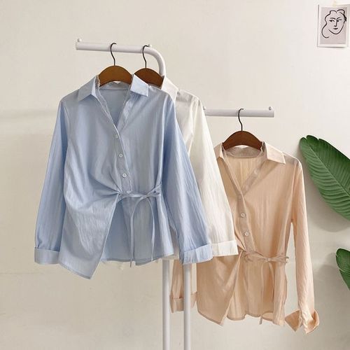 Wolfeel 100% 면 신상 가을 타이 벨트 셔츠 여성용 플로팅 리본 가디건 탑 출퇴근용 슬림 블라우스